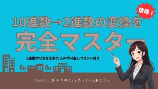 10進数から2進数への変換、もう忘れてしまった高校生へ。共通テスト「情報Ⅰ」で必須の2進数変換を、割り算だけで解ける3ステップでやさしく解説。0と1が苦手でも大丈夫!図解感覚で理解でき、無料のやり直しプリント付きで本番対策まで一気に完成します。