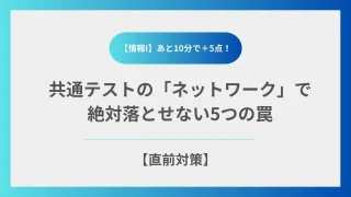 情報通信ネットワークとデータの活用 【情報I】あと10分で+5点!共通テストの「ネットワーク」で絶対落とせない5つの罠【直前対策】 共通テスト「情報I」のネットワーク・セキュリティ分野で失点しないための直前対策記事。配線図の読み取り、WANとLANの役割、Wi-Fiの暗号化表示、ブルートフォース攻撃の考え方、情報セキュリティの3要素(CIA)など、共通テストで実際に問われる“判断ポイント”を高校生向けにわかりやすく解説します。本番前10分で確認できる内容です。 2026.01.08 情報通信ネットワークとデータの活用